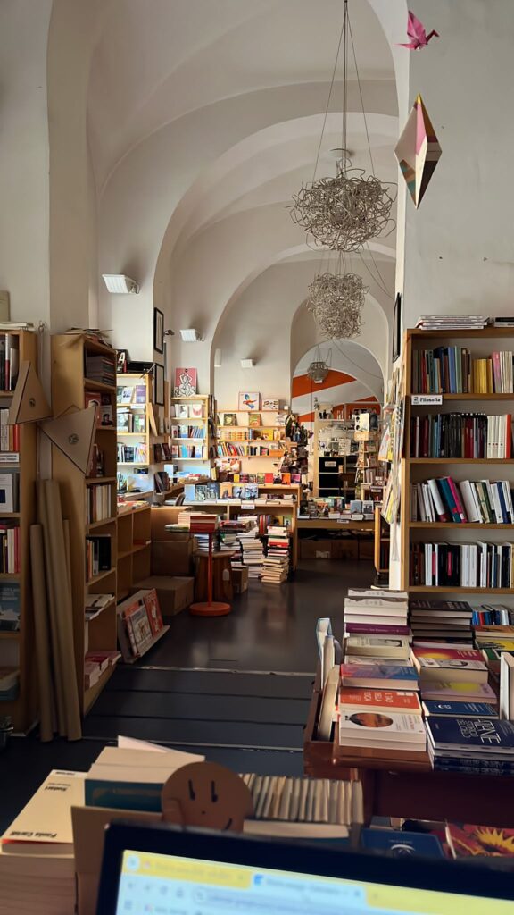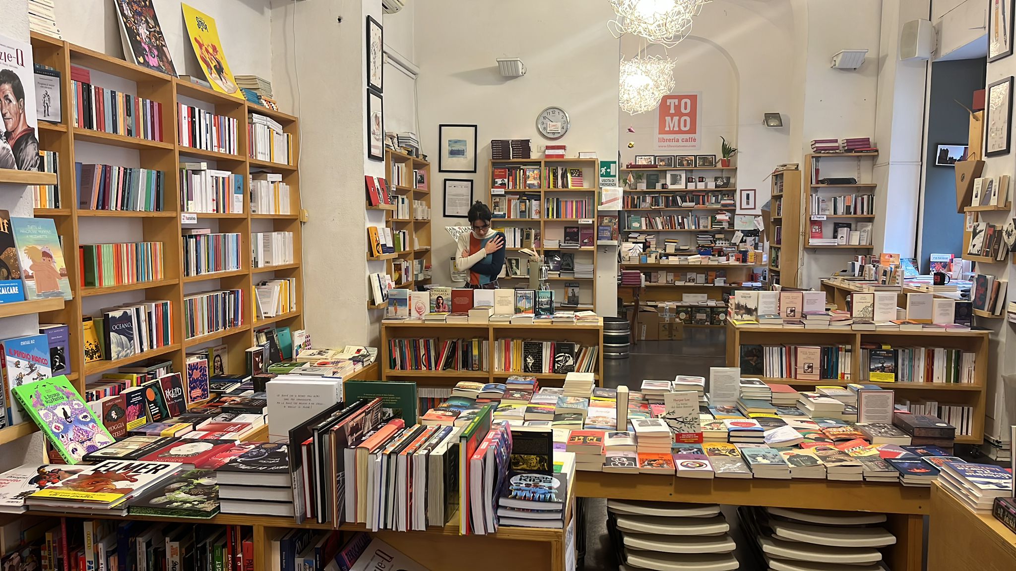 Tomo Libreria Caffè è una libreria indipendente di media grandezza che dal 2010 esprime le proprie potenzialità culturali e imprenditoriali a partire dal quartiere romano di San Lorenzo dove è situata. Grazie alla conformazione dei locali di via degli Etruschi che la ospitano ormai da 15 anni, noti ad alcuni per aver ospitato in passato un leggendario negozio di musica – Disfunzioni Musicali – e comprensivi oggi di caffetteria, sala studio e sala conferenze, Tomo ha presto superato la principale missione per cui era stata pensata e fondata – essere una libreria indipendente-, per aprirsi ad un pubblico più vasto e diventare un vero e proprio hub culturale, ormai noto anche oltre GRA. Al di là di ogni principio di targettizzazione, Tomo accoglie famiglie, studenti universitari, professionisti free lance, anziani, ghiotti degustatori di buon cibo e vino ricercato, artisti, musicisti. A partire da un numero considerevole di soci, molte dei quali provenienti da realtà scientifiche, la storia della nostra libreria vede alternarsi diversi progetti culturali sempre mirati ad una qualità rigorosamente ricercata nei contenuti proposti, sempre offerta a un pubblico sia specialistico che non, per il piacere di condividere conoscenza e tempo libero. Se pensi ai corsi tenuti nei primi anni da un jon ancora Premio Nobel Giorgio Parisi, ai corsi e concorsi di scrittura di fantascienza curati da specialisti del settore. E, per tornare alla poesia, il privilegio di custodire un ampio assortimento delle pubblicazioni Nino Aragno editore. Questa collaborazione nata per esigenze pratiche, si è poi rivelata fondante rispetto al forte legame che i poeti romani e non sentono con i nostri luoghi. Casa Tomo, si dice. Se oggi abbiamo la felice opportunità di comparire tra le pagine di Ritratti di Poesia è in effetti perché dal 2019 la Poesia è stata il motore principale del piacere per il nostro lavoro di librai. Dove le notizie di natura internazionale faticano a darci sollievo, la Poesia interviene nelle nostre vite e resta, portando nuovi equilibri e accendendo nuove prospettive culturali. Questo avviene da Tomo attraverso un’accurata selezione dei libri che si possono trovare tra i nostri scaffali e di conseguenza grazie all’organizzazione di incontri poetici che dai libri sempre felicemente si accendono.